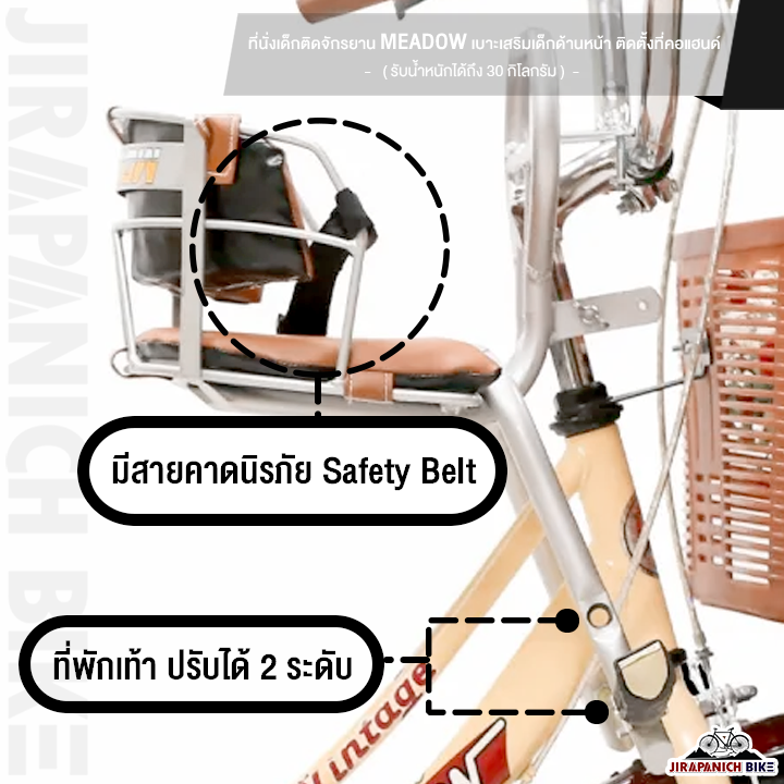 ที่นั่งเด็กบนจักรยานแม่บ้าน ติดตั้งเสริมเพื่อให้เด็กนั่ง ถูกออกแบบให้มีความปลอดภัยสูงด้วยสายคาดนิรภัย “Safety Belt” ป้องกันเด็กตกจากจักรยาน คุณสามารถวางใจได้ถึงแม้ลูกน้อยจะนั่งอยู่บนจักรยานกับคุณ นอกจากนี้ตัวที่นั่ง และพนักพิงหลังบุด้วยเบาะหุ้มหนัง PVC อย่างดี นั่งสบาย ขนาดเหมาะสำหรับเด็กวัย 1-3 ปี หรือมากกว่า (ขึ้นอยู่กับขนาดตัว) และสามารถรับน้ำหนักได้ถึง 30 กิโลกรัม